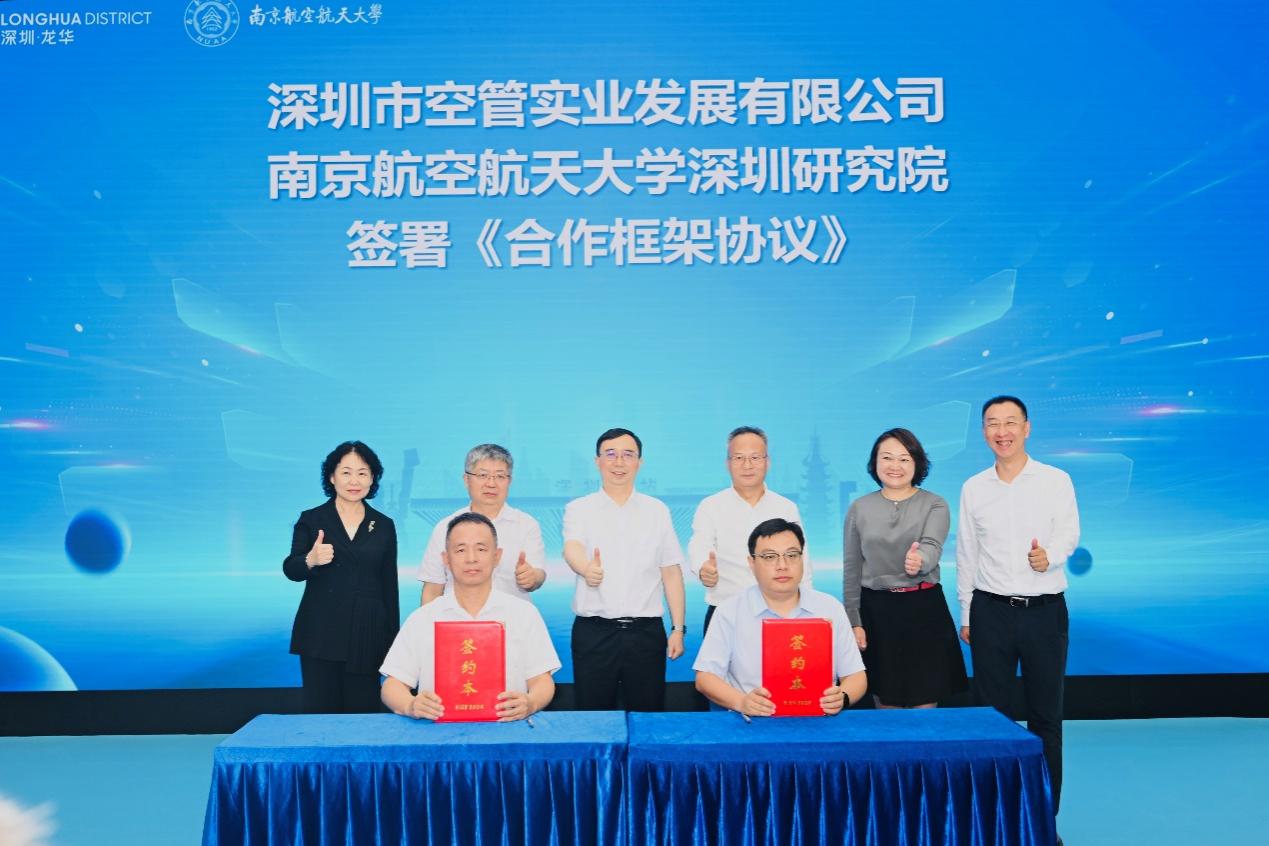 在姜斌、汪洪蛟、胡斌、李遥、王晖、范文梅见证下,南航深圳研究院执行副院长吴庆春与空管站深圳市空管实业发展有限公司党总支书记刘铁军签署了《合作框架协议》,双方围绕低空领域,就人才培养、科研合作、产业转化等方面达成合作意愿,进一步支持南航深圳研究院做实做强。