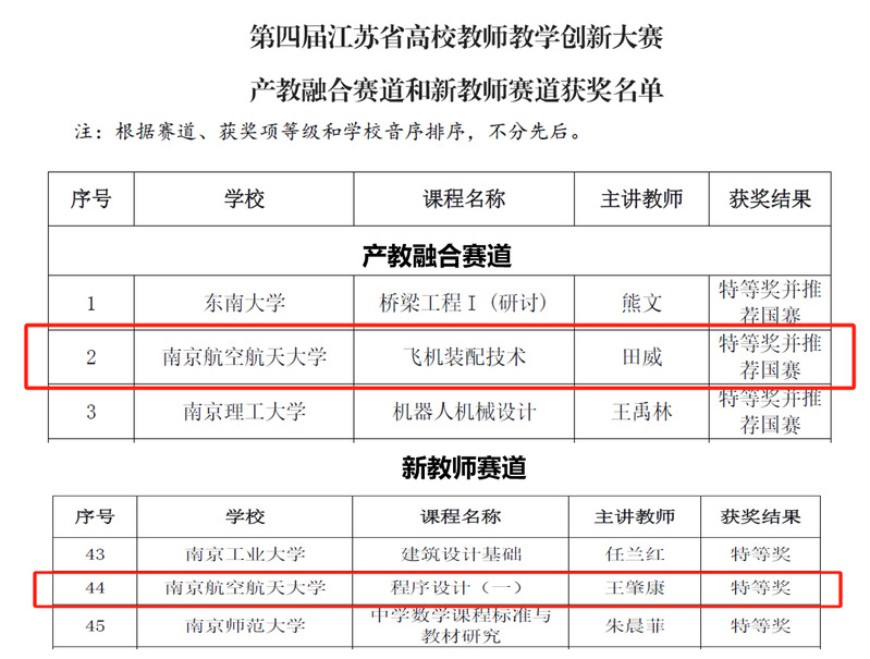 近日,第四届江苏省高校教师教学创新大赛产教融合赛道及新教师赛道获奖名单公布,我校进入现场决赛的两位教师均获省特等奖,其中机电学院田威教授的《飞机装配技术》荣获产教融合赛道特等奖并推荐国赛,计算机科学与技术学院王肇康副教授的《程序设计(一)》荣获新教师赛道特等奖。至此,我校在本届江苏省高校教师教学创新大赛中共获得5项特等奖,其中3项推荐国赛,推荐国赛总数名列全省并列第一。