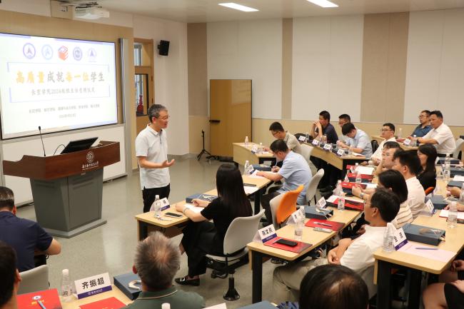 庞依达简要概述了学院2024级新生生源情况,系统解读了以“院院协同”为背景的“润&致”学院文化体系,并详细介绍了以“开一节班会、访一次宿舍、领一次行学党史、伴一次运动、品一杯润致咖啡”为牵引的书院制班主任工作体系,期待班主任们以“柔性、丰富、多样、有效”的师生互动,为学生的全面发展提供有力保障。