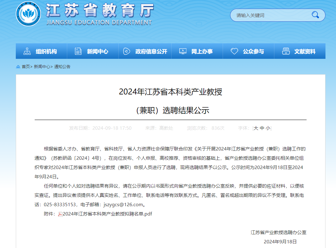江苏省本科产业教授选聘工作由江苏省人才工作领导小组办公室、江苏省教育厅、江苏省科学技术厅、江苏省人力资源和社会保障厅联合组织实施,今年是第三次开展本科类产业教授选聘,目前学院共有江苏省产业教授6名。