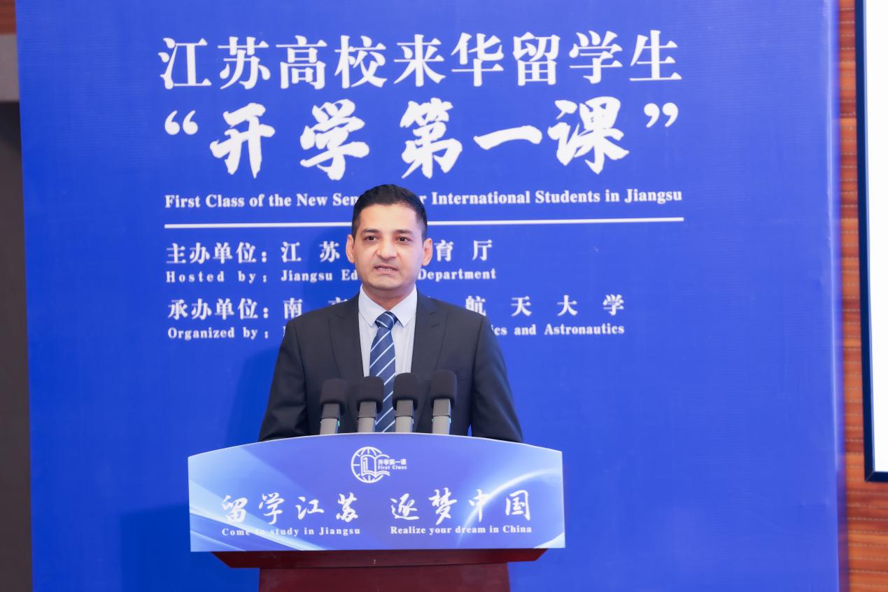 施大宁代表学校致辞,向到场的领导、教师和学生表示热烈欢迎。他强调,来华留学教育在提升我国教育国际影响力方面发挥重要作用,南航的来华留学教育长期注重内涵建设,今年又以A等级高质量通过来华留学高等教育质量再认证,“留学南航”品牌影响力持续扩大。放眼未来,学校将继续贯彻党的二十届三中全会精神,培养更多具有“责任意识、创新精神、国际视野、人文情怀”的创新型国际人才,培养更多中外友好合作的见证者、受益者、建设者和传播者,讲好中国故事、传播中国经验,为推动构建人类命运共同体提供坚实人才支撑,为强国建设和民族复兴贡献更大的南航智慧和力量。