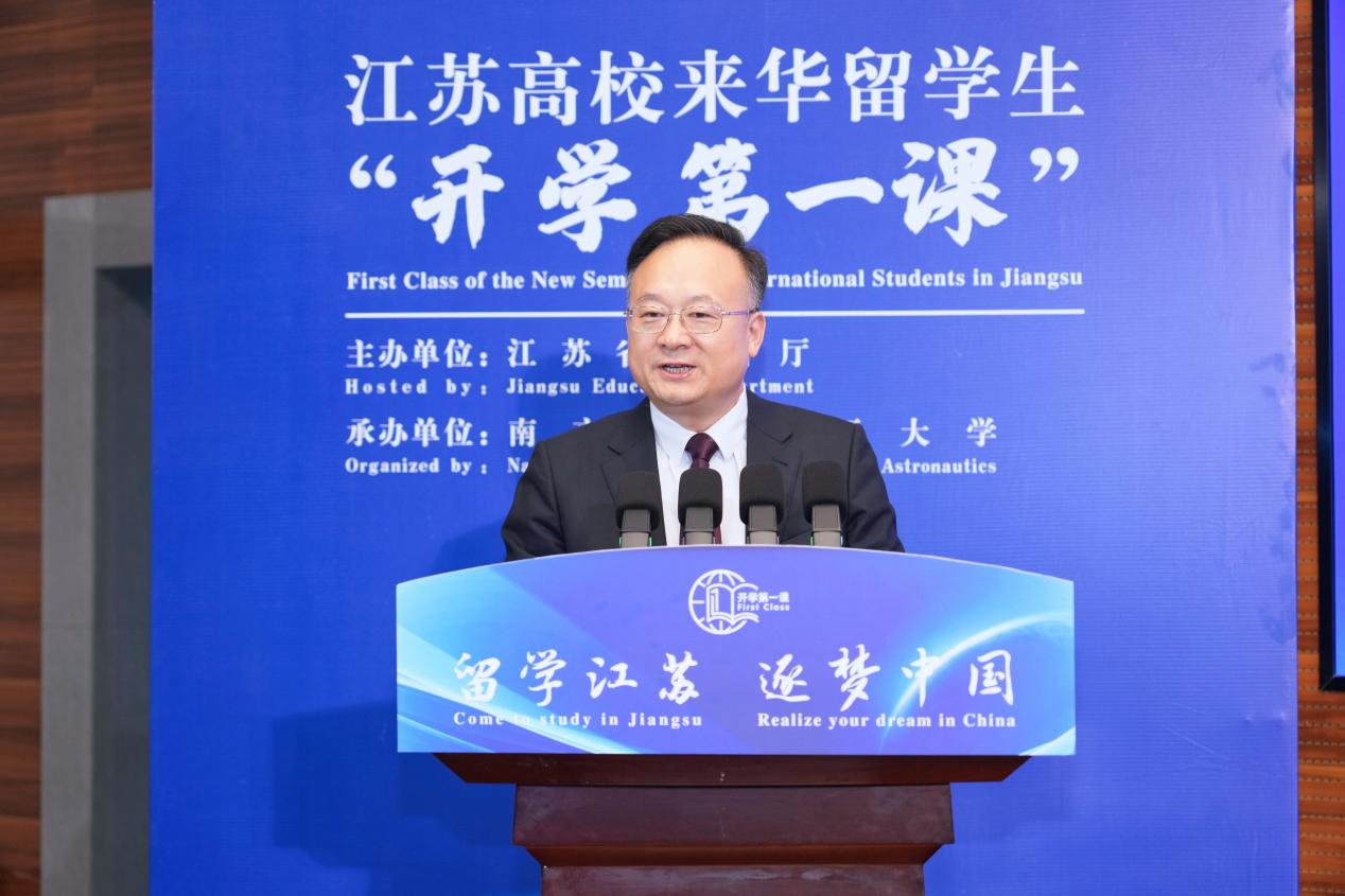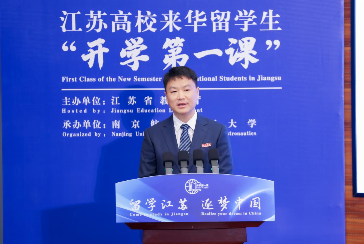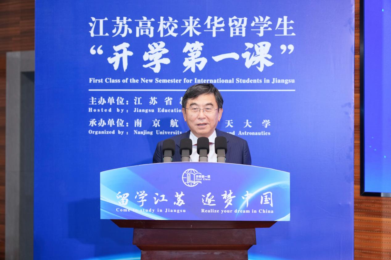 9月26日,由江苏省教育厅主办、南京航空航天大学承办的“留学江苏 逐梦中国”2024年江苏高校来华留学生“开学第一课”在我校将军路校区举行。省教育厅副厅长杨树兵、省外办副主任金尚军、省公安厅出入境管理局政委施霄慧,副校长施大宁,党委常委、宣传部部长、教师工作部部长王晖出席活动。来自南京大学、东南大学、苏州大学、南京医科大学、南京航空航天大学、河海大学、江苏大学等全省12所高校的来华留学生培养相关部门负责人和留学生代表近400人出席了此次活动。