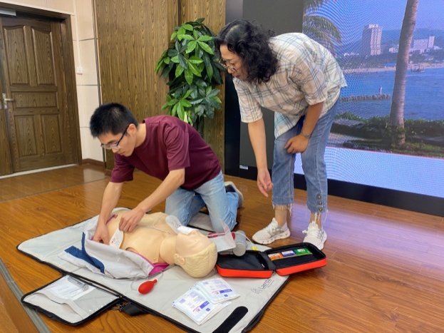 在接下来的实践操作过程中,陈晓梅亲自示范,规范地展示了每一个动作,从按压的位置、力度到频率,以及人工呼吸的方法和注意事项,都进行了细致的讲解和演示。师生们全神贯注地聆听,认真观察每一个细节。随后,师生们纷纷踊跃参与实际操作。陈晓梅在一旁耐心指导,及时纠正大家在操作过程中出现的错误,确保每一位参与者都能正确掌握心肺复苏和基本急救知识和技能。