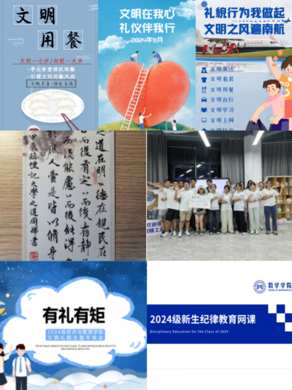 驻区学院依托其专业特点和相关优势,旨在激发学生文明礼貌的创造热情,针对文明礼貌这一主题,精心策划并开展了一系列独具特色的活动。电子信息工程学院、集成电路学院、外国语学院和通用航空与飞行学院以班级为单位,结合专业特点,进行了特色文明主题海报设计与书法展示;数学学院开展了一次生动有趣的新生纪律教育网课,深化认识,激发了更多学生参与文明建设的热情;经济与管理学院制作“文明礼貌教育月”宣传ppt与“文明校园我先行”宣传片,通过幽默有趣的宣传形式,在学生群体中传播学习,形成良好教育效果;物理学院在“展示学生的创造能力,体现班级的文化特色”的基础上创建文明班级,进一步加强了同学们的自我管理和自我约束能力,营造了健康向上、富有成长气息的班级文化氛围。