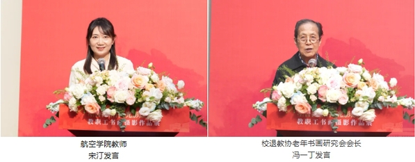 开幕式上,航空学院教师宋汀和南京市书协会员、我校退教协老年书画研究会会长冯一丁分别作为本次入展的在职教职工代表和离退休教职工代表现场发言。