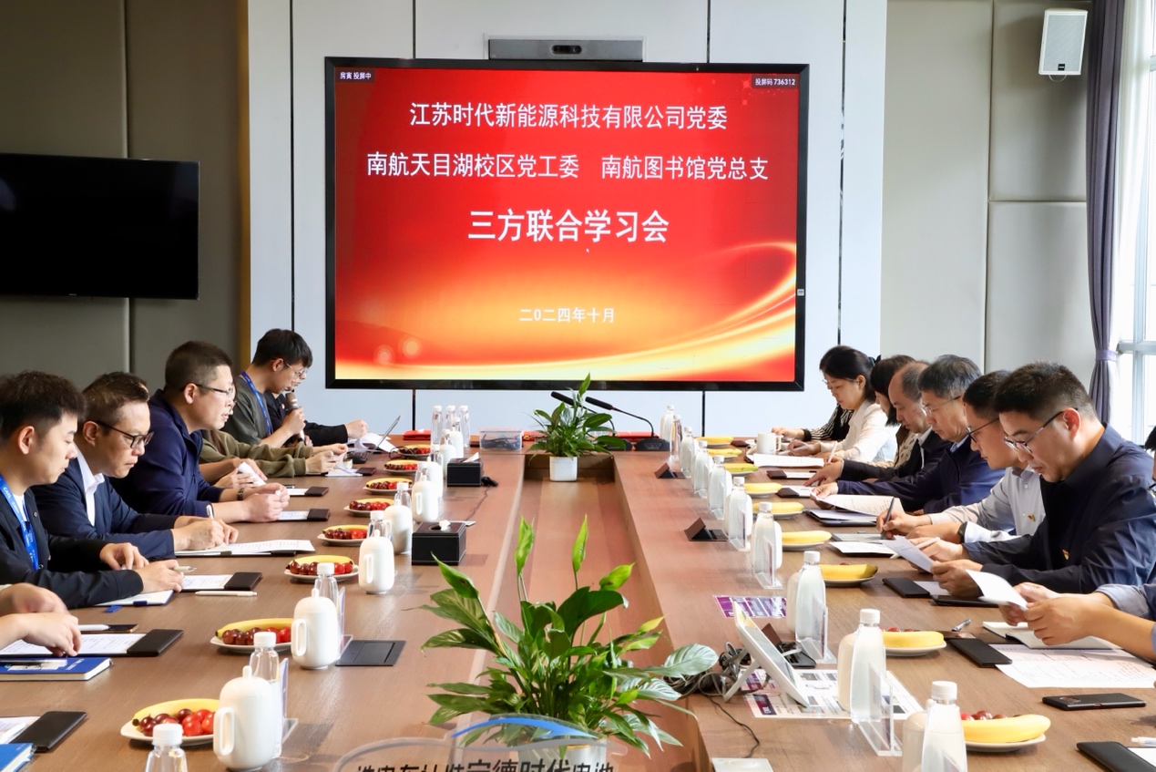 10月15日上午,图书馆党总支、天目湖校区党工委与江苏时代新能源科技有限公司(以下简称江苏时代)党委联合开展学习,深入学习贯彻党的二十届三中全会精神,进一步加大改革力度,推动校企事业创新发展。