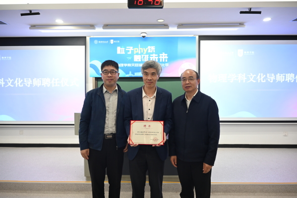 刘友文、李晋斌为盛正卯颁发“物理学院学科文化导师”聘书,并举行了聘任仪式。