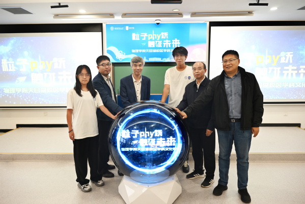 盛正卯、刘友文、贡海俊、李晋斌以及2024级本科新生代表在全场师生们热烈的掌声下,共同启动物理学院“粒子phy跃 触碰未来”天目湖校区学科文化季,寓意湖区本科新生像一颗颗小粒子,在老师的引领下持续修学储能,实现知识和境界的双重飞跃,运用物理专业所学勇敢追求、创造美好未来。