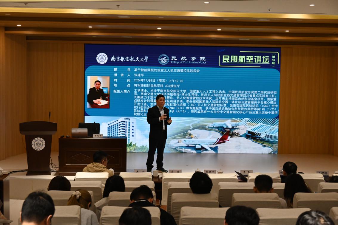 11月8日上午,民航学院成功举办第58期“民用航空讲坛”暨张建平兼职教授聘任仪式。国家重大人才工程入选者、中国民用航空总局第二研究所研究员、民用无人驾驶航空器交通管理四川省重点实验室主任、民航学院院友张建平受邀作题为《基于智能网联的低空无人机交通管控实践探索》主题报告。民航学院党委书记李君、通用航空与飞行学院院长王勤、南方航空公司地服部副总经理程启平,民航学院各系主任、师生代表共200余人参加报告会,报告会由民航学院党委副书记王艳主持。