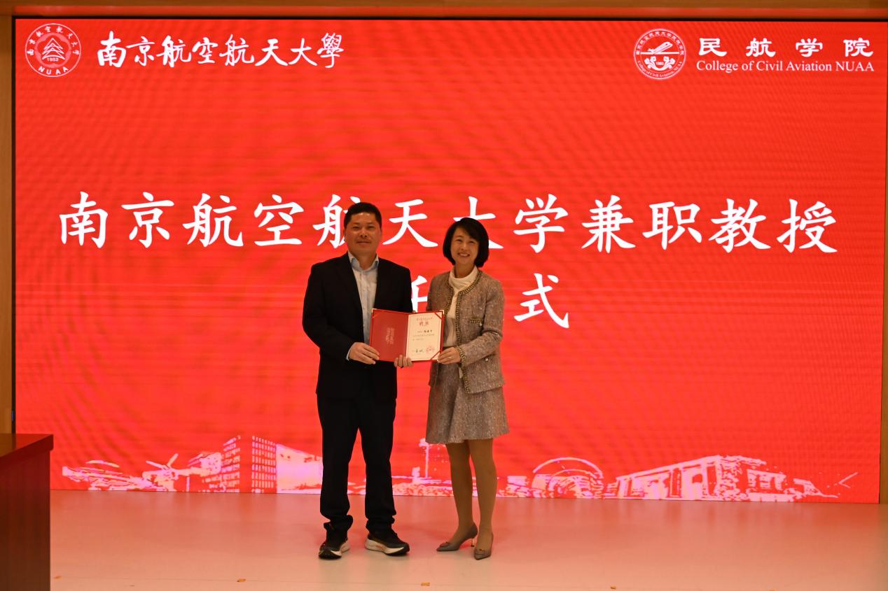 李君为张建平颁发兼职教授聘书。张建平表示,作为南航校友、民航院友,此次受聘为南京航空航天大学兼职教授,既是荣誉,更是责任。未来将积极履行南航兼职教授职责,进一步在学术交流、科研合作、人才培养等方面推进合作,为“交通强国”民航新篇章建设做出更大贡献。