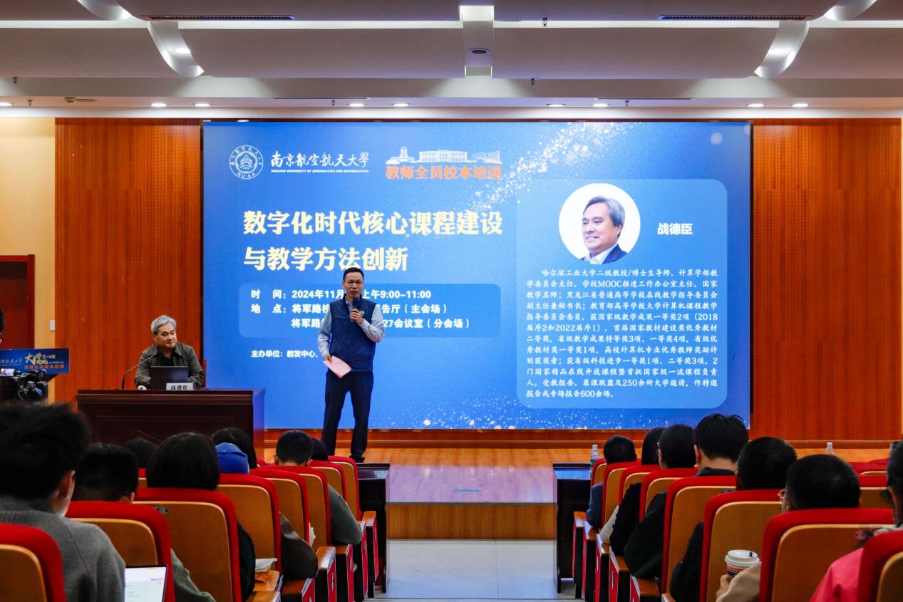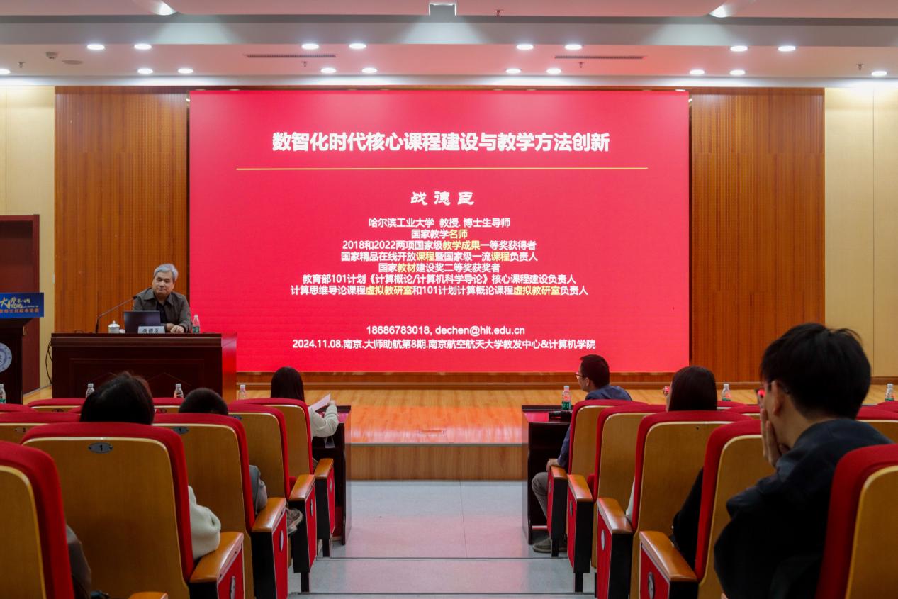 11月9日,计算机学院与教发中心联合举办学校教师全员校本培训——“大师助航”通识计划第八期报告会,哈尔滨工业大学教授、国家教学名师战德臣受邀来我校作“数字化时代核心课程建设与数学方法创新”报告。报告会设图书馆报告厅主会场与1号教学楼10527报告厅分会场。计算机学院院长黄圣君主持会议。