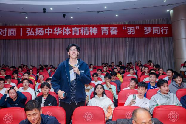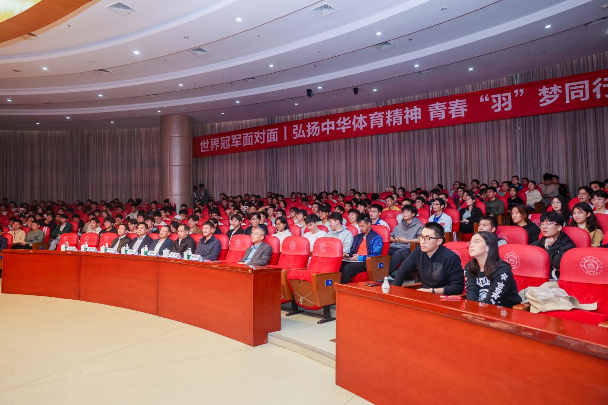 陈金以《业精于勤 行成于思——我的羽毛球生涯》为题,向同学们分享了他作为运动员、教练员、教授的成长经历和个人体悟。他在运动生涯先后斩获9次世界冠军,包括世锦赛冠军、汤姆斯杯4连冠、北京奥运会铜牌等荣誉,为国争光。任职教练员期间,他带队获得6次世界冠军,连续3年获得全国优秀教练员奖章。他认为“勤奋刻苦,知行合一;精益求精,不骄不馁;锲而不舍,不言放弃”的精神是他不断进步、奋勇摘金的关键。同时,他也指出“梦想和目标非常重要,行动非常重要,要提高行动效率,讲究策略”。他的讲座让现场师生充分感受到了世界冠军为国争光的高度使命感和全力以赴、顽强拼搏的精气神。