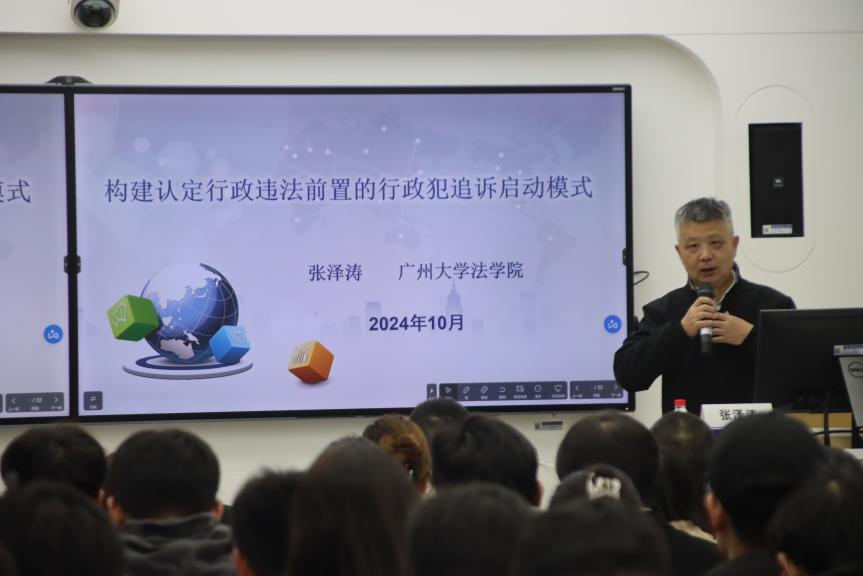 11月19日晚,人文与社会科学学院在院楼213教室开展第八期“人文大师课”专题讲座。广州大学法学院二级教授张泽涛以《构建认定行政违法前置的行政犯追诉启动模式》为主题作了专题报告。学院法学专业师生代表参加了本次讲座,讲座由院长高志宏主持。