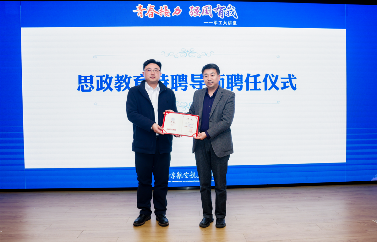报告会现场,孙占久向周江涛颁发南京航空航天大学航天学院“思政特聘导师”聘书。