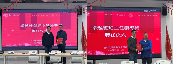 为完善培育机制,体现“卓越计划”的校企合作特色,自动化学院副院长魏佳丹向阳光电源/储能事业部变流研发中心总监李勇颁发“卓越计划”行业导师聘书,电气工程及其自动化专业负责人王晓琳向电气工程“卓越班”0323208班班主任秦海鸿颁发班主任聘书。