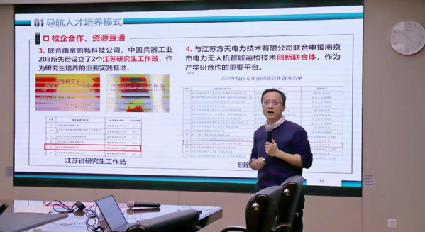 赖际舟结合多年以来丰富的教育教学经验,围绕团队基本情况、导航专业特色、人才培养体系和模式探索、创新实践成效以及心得体会等方面展开介绍。他认为,导航领域正面临国家重大战略和支撑产业发展的新时代需求,构建“以红色教育为灵魂、以校企合作为平台、以场景驱动为牵引、以创新竞赛为实践”的创新育人模式,对培养具备卓越工程能力的导航专业人才具有重要引领作用。他还以两个江苏省研究生工作站为例,分享了校企双方从合作伊始到收获硕果的历程,强调共建平台、共享资源、共育人才、共创成果的重要性,鼓励学生做有的放矢、有感而发的科研。