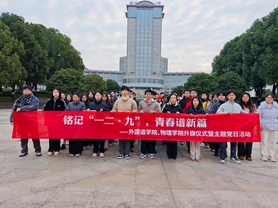 铭记历史,不忘初心。今天是“一二·九”抗日救亡运动89周年纪念日,外国语学院联合物理学院共同举办“铭记‘一二·九’,青春谱新篇”升旗仪式暨主题党日活动。外国语学院党委副书记吴科颖,物理学院党委副书记欧珊,两学院辅导员代表朱芸、于金巧,外国语学院本科生联合党支部党员代表、积极分子、发展对象代表,物理学院全体本科生党员、2023级全体本科生参加活动。