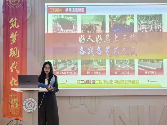 本科2021级党员代表王诗琪分享了暑期社会实践过程中前往中航发贵州黎阳和沈阳黎明与行业前辈进行深入交流的实践心得,号召同学们传承航空报国精神,为祖国的航空事业添砖加瓦。