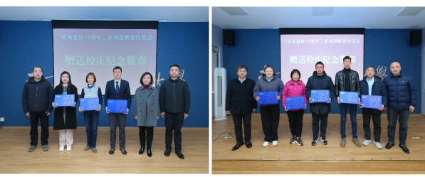 党委书记刘建成、院长王伟分别向捐赠代表赠送校庆纪念徽章