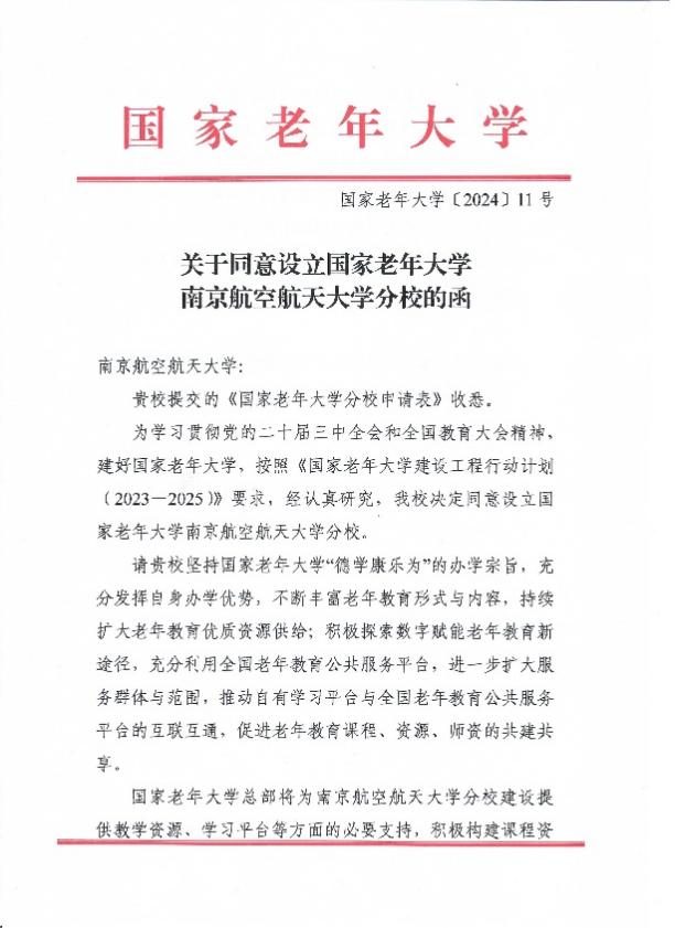 近日,国家老年大学正式发函,同意设立“国家老年大学南京航空航天大学分校”。这是我校老年大学继2023年12月荣获“江苏省示范老年大学”称号之后再获殊荣,标志着我校老年大学在服务离退休教职工文化养老需求、推动老年教育事业方面再上新台阶。