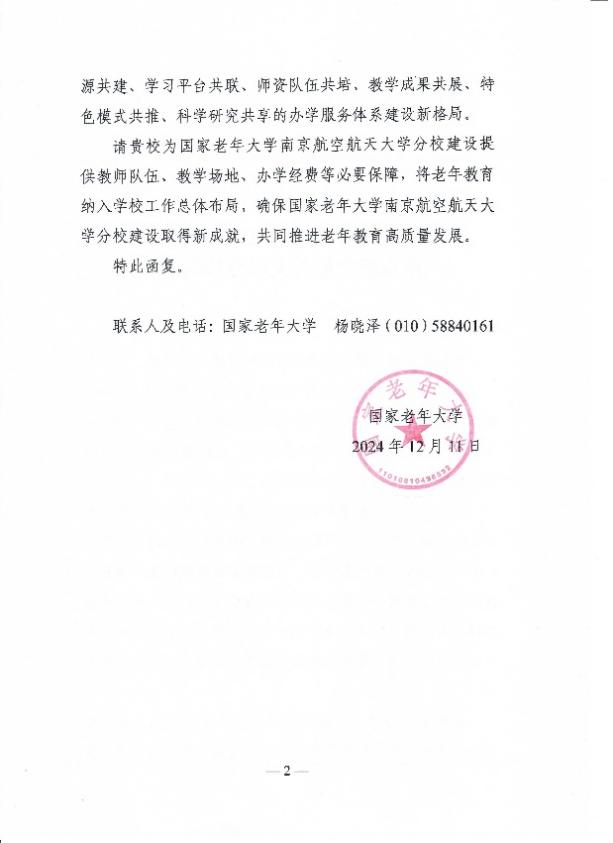 国家老年大学于2023年3月3日挂牌成立,为落实教育部党组关于国家老年大学建设工作的要求,推动相关高校老年教育加入国家老年大学办学体系。我校对标国家老年大学办学标准与要求,深入广泛开展调研,依托自身特色与优势,结合三十多年办学经验,提交申报材料,成功获批“国家老年大学南京航空航天大学分校”。