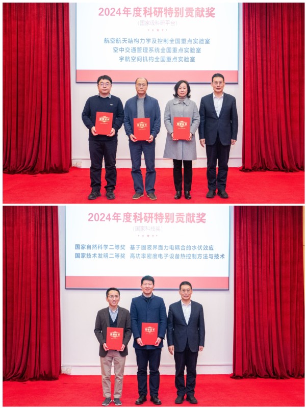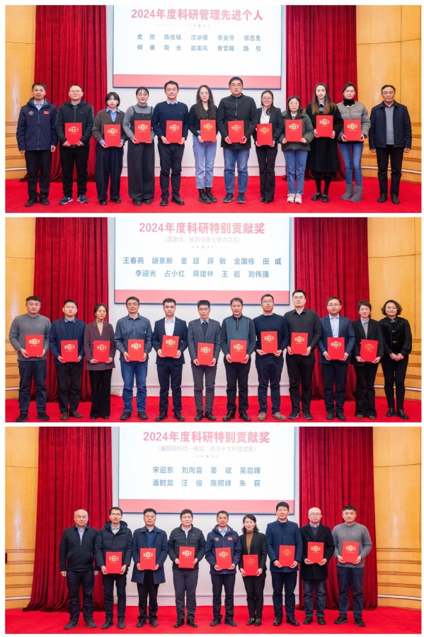 会上表彰了2024年度科研管理先进个人,崔海涛、潘时龙为获奖者颁奖。王晖、黄志球分别为重大重点项目负责人代表、重大科技成果完成人代表颁发了科研特别贡献奖。