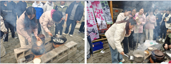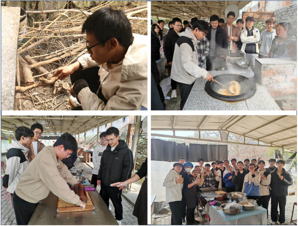 第三站,同学们走进厨房,跟随指导员老师学习炒米糕的制作技艺。从烧火开始,再到炒制糖浆,同学们平日眼中“唾手可得”的小事,此刻都显得“力不从心”。从热气升腾的炒米到最后定型成糕,大家相互协作,制作出美味可口的糕点,空气中弥漫着香甜的气息。吃到了自己做的美食,同学们格外满足。