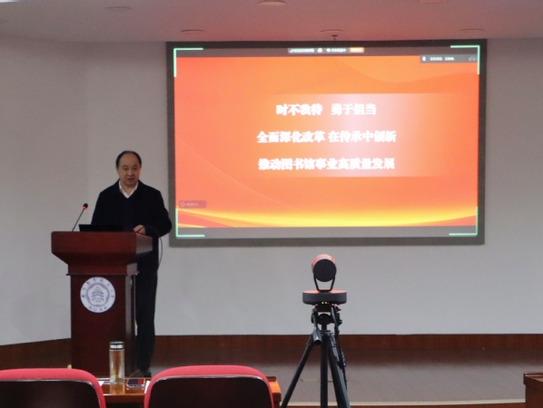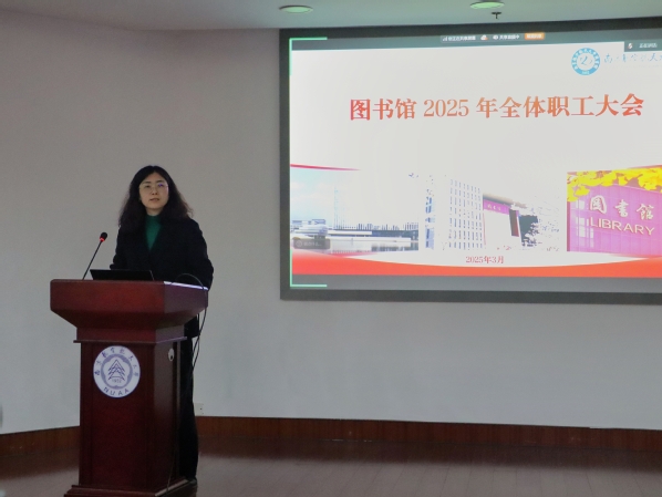 馆长袁家斌代表图书馆领导班子向大会作2025年图书馆工作要点报告。他表示,2025年图书馆坚持以习近平新时代中国特色社会主义思想为指导,深入学习贯彻党的二十届三中全会精神,以天目湖校区图书馆建设为契机,进一步发挥图书馆在立德树人根本任务中的重要阵地作用,建设平安、数智图书馆。2025年的重点工作将围绕全面推进党建与业务深度融合、持续开展特色精品阅读活动、稳步推进天目湖校区新馆建设、保障纸电资源配置、深入发挥智库作用、提升信息素养教育等六个方面开展。他号召全体馆员在新的一年里,秉持时不我待的紧迫感与使命感,以勇于担当的精神积极投身工作,以饱满的热情、全新的姿态推动图书馆事业高质量发展。
