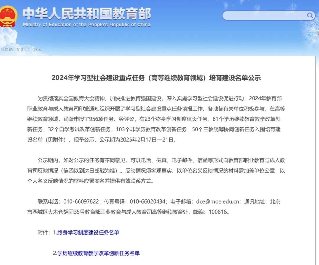 近日,教育部职业教育与成人教育司公示了2024年学习型社会建设重点任务(高等继续教育领域)培育建设名单。我校申报的《构建“三融五跨”人才培养模式,推动自考专业建设及课程体系改革》项目,成功入选自学考试改革创新任务。