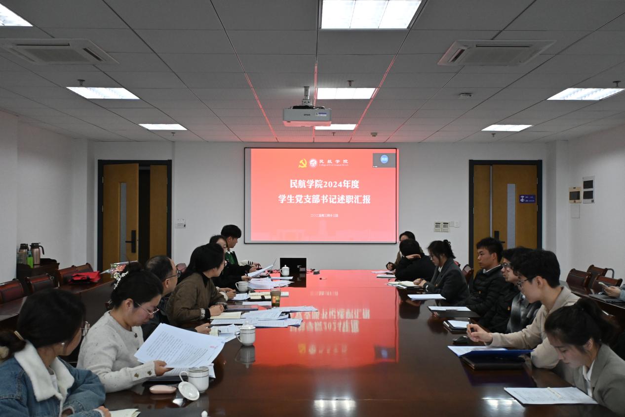 为深入学习贯彻习近平新时代中国特色社会主义思想和党的二十届三中全会精神,进一步加强基层党组织建设,推动全面从严治党向基层延伸,3月13日上午,民航学院召开2024年度学生党支部书记述职评议会。民航学院党委副书记王艳、校内首批样板支部培育建设单位空中交通系党支部书记董襄宁、组织员贺彩、学生党总支委员、全体学生党支部书记参加会议。会议由辅导员李展鹏主持。