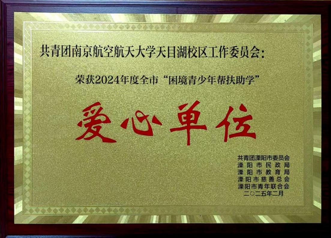 2025年2月,凭借项目中的突出表现,共青团南京航空航天大学天目湖校区工作委员会荣获2024年度全市困境青少年帮扶助学项目--“爱心单位”,刘泰源等三位同学获评2024年度困境青少年帮扶助学项目--“优秀志愿者”称号。