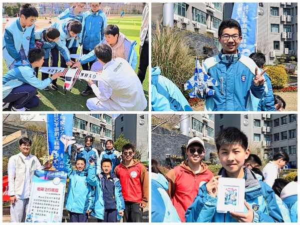 学院的志愿者们还为同学们准备了航模拼装体验和趣味盖章活动。同学们席地而坐,一边聆听志愿者的精彩讲解,一边沉浸式地拼装自己手中的航模。同学们兴奋地按下电源,随着螺旋桨的嗡鸣声,航模飞机成功飞了起来,同学们小小飞天梦也在此启航。