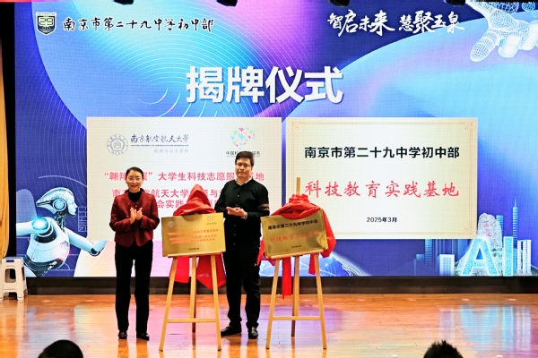 3月19日下午,我校能源与动力学院“翱翔之翼”科技志愿服务团队走进南京市第二十九中,联合举办校园首届科技节。学院与南京市第二十九中学初中部设立“科技教育实践基地”和“大学生社会实践与志愿服务基地”并举行揭牌仪式。