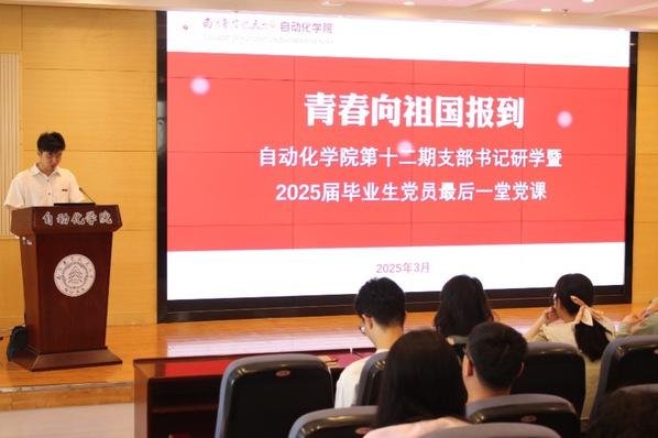 自动化学院党委副书记丁琛为2025届毕业生党员讲最后一堂党课。丁琛结合高校研究生教育培养、行业发展方向为毕业生党员解读了2025年全国两会重要精神。他指出,青年党员在复杂舆论环境和多元思潮背景下,必须树立远大理想,牢记党的初心使命。他激励同学们要在新时代科技革命的浪潮中勇立时代潮头,在党和国家的正确领导下阔步前行。