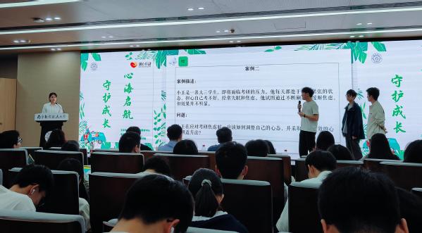 本次心理知识竞赛决赛在初赛基础上进行,初赛获奖选手组成了9支代表队进行了现场答题,包括必答题、抢答题和案例题三个环节。必答题环节,各参赛队伍沉稳应对,充分展现了扎实的基础知识储备。抢答题环节,不仅是心理知识的比拼,更是手速与反应能力的较量。选手们的精彩回答赢得了现场观众的阵阵掌声。前两个环节后,得分排名前五的队伍进入了最终PK——案例题环节。面对一个个大学生常见心理困扰的案例,各队选手沉着应对,冷静思考并条理清晰地分析问题,充分展现了他们在自我心理调适及助人技巧方面扎实的知识储备和专业技能。