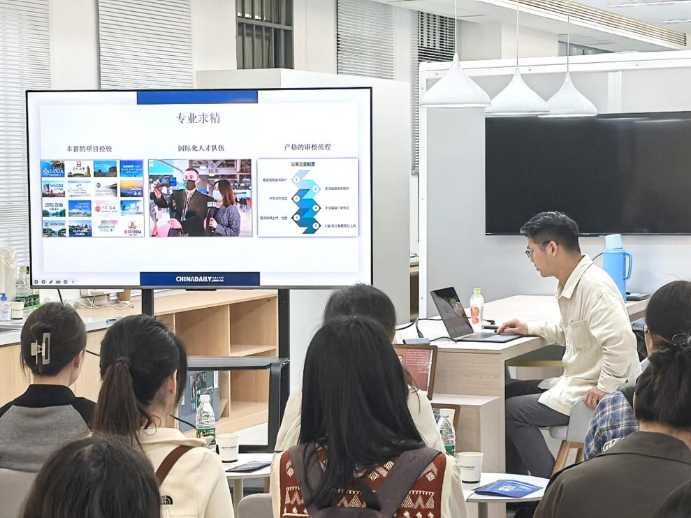 活动伊始,吴科颖致开场词,对中国日报网无锡公司的到来表示诚挚的欢迎。她简要介绍了外国语学院的办学特色与学科优势,同时向学生们阐述了中国日报网在新闻传播领域的卓越影响力及其行业内的领先地位。她指出,长期以来,学院学生一直将CHINADAILY作为重要的学习平台,在英语学习、国际视野拓展以及跨文化交流等方面受益匪浅。她希望同学们能够珍惜此次难得的交流机会,积极与企业代表互动,汲取更多宝贵经验。