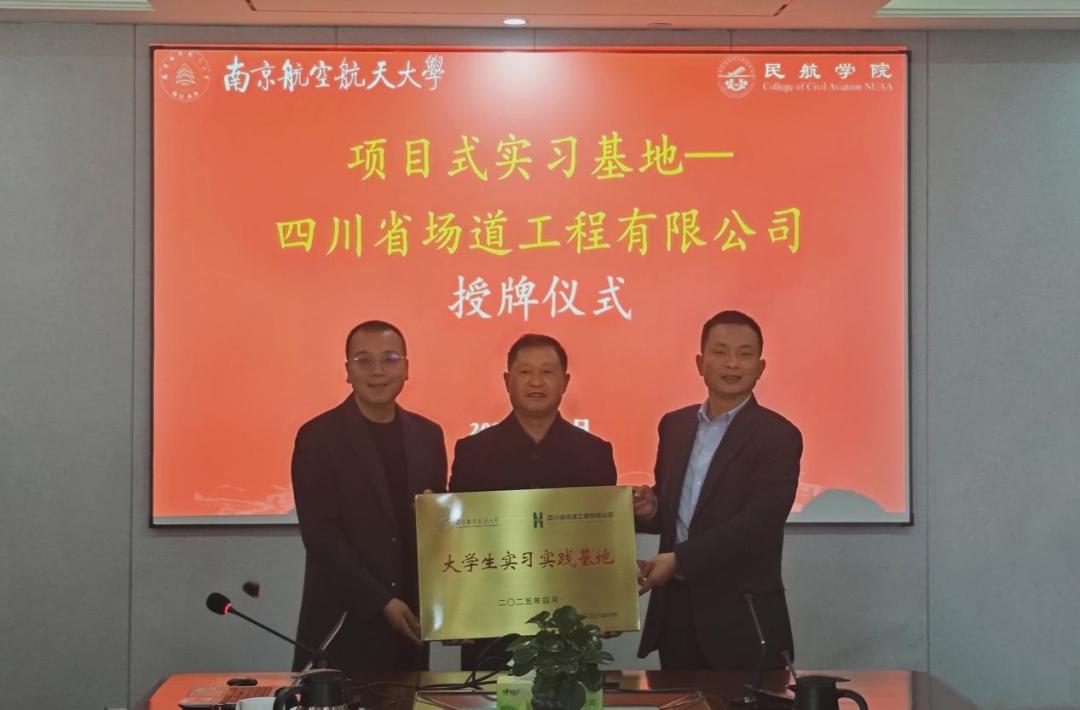 为加强学生实践能力培养、促进产学研深度融合,4月1日上午,民航学院与四川省场道工程有限公司举行共建土木与机场工程系项目式实习基地授牌仪式。四川省场道工程有限公司副总经理张洪远,民航学院党委书记李君,校教务处副处长柯世堂参加活动。民航学院副院长田勇主持活动。
