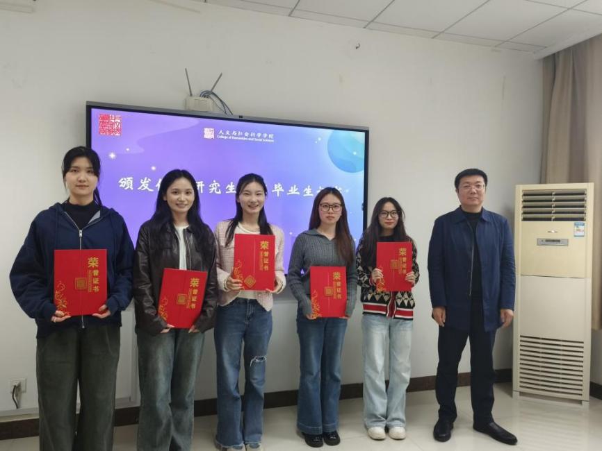 楚广兴为优秀毕业生颁发荣誉证书,对同学们研究生阶段所取得的优异成绩做出肯定。