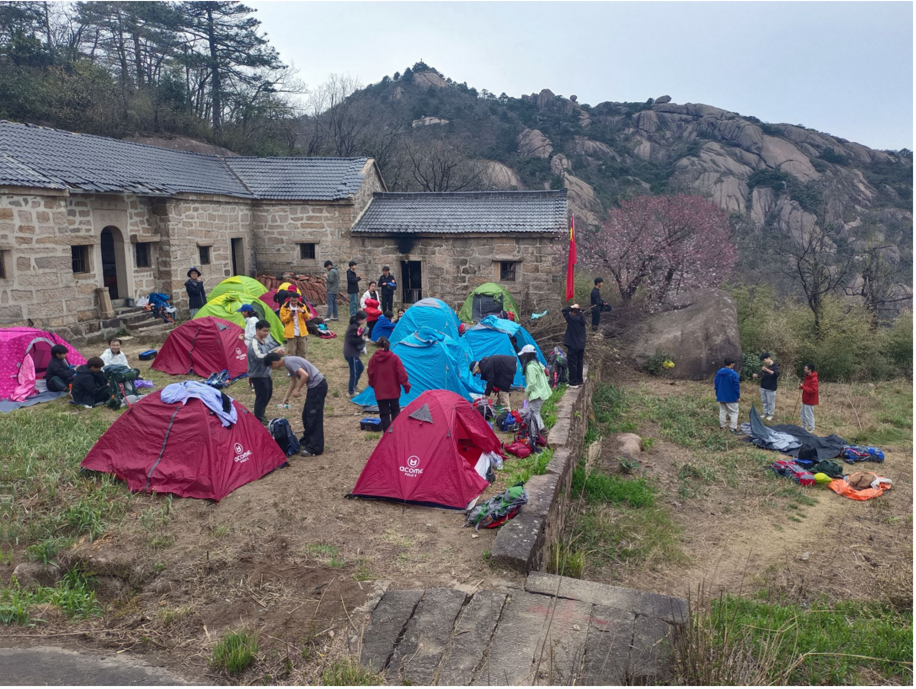 4月4日早上7点40,全体成员在将军路校区西大门集合,乘坐大巴前往安徽省池州市青阳九子岩风景区,下午1点抵达目的地后正式开始徒步进山,团队推进约3小时到达露营地,随后按预先分组开始搭建帐篷准备露营。