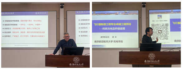 在飞制卓越班宣讲会上,黄翔教授介绍了专业科研实力、就业前景及培养模式,强调了以新工科建设为导向、突出产教融合、注重学生实践与创新能力培养的特色。他通过团队参与的C919部分装配工作等科研案例,展现了先进制造技术与新一代信息技术的深度融合,并鼓励同学们加入飞制卓越班,成为航空宇航制造领域的顶尖人才。教学系主任武永副教授介绍了飞制专业的科研方向,解读了全面升级的卓越班培养政策,指出飞制卓越班聚焦智能装配等前沿领域,一对一配备导师开展科研实践训练,专门设置了项目式课程、专创融合课程、产教融合课程和企业课程,培养学生解决复杂工程问题能力。