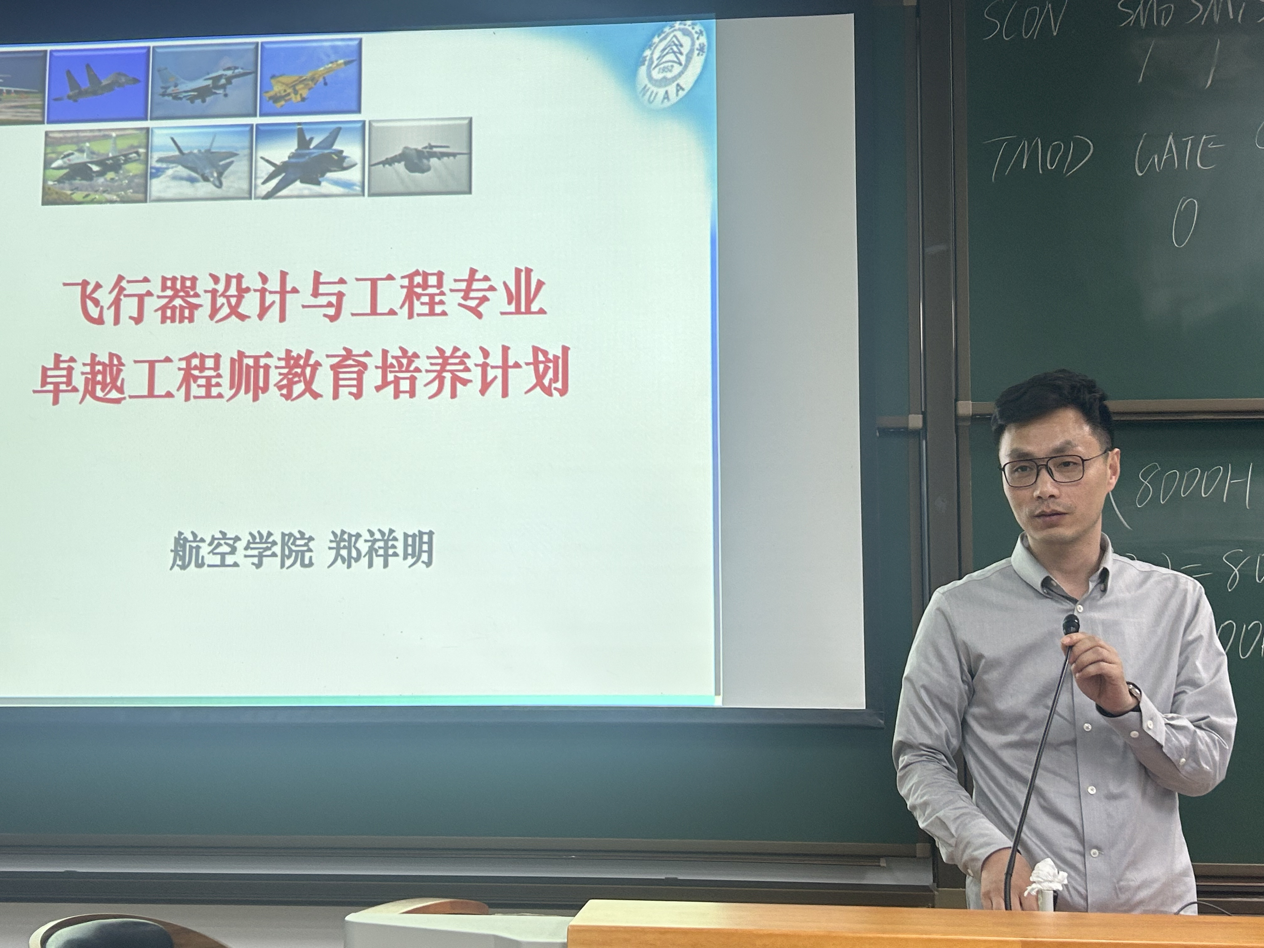 在飞设卓越班宣讲会上,研究生院副院长、飞设卓越班班主任郑祥明教授重点介绍了该班的培养特色:依托国家重点实验室等高水平科研平台,借力联合优势企业,实行校企共建实习基地,重点提供工程训练、工程实习机会,突出培养学生工程实践能力、工程设计能力、工程创新能力、终身学习能力和自我发展能力。他还展示了往届卓越班的培养成效,并鼓励有志于成为未来飞机设计总师的同学,加入飞设卓越班,投身航空报国事业。19级飞设卓越班班长李嘉璐同学分享了班级同学互帮互助、共同进步的故事,21级飞设卓越班班长李彦博同学分享了卓越班的校企实习经历,直观展现了培养特色。