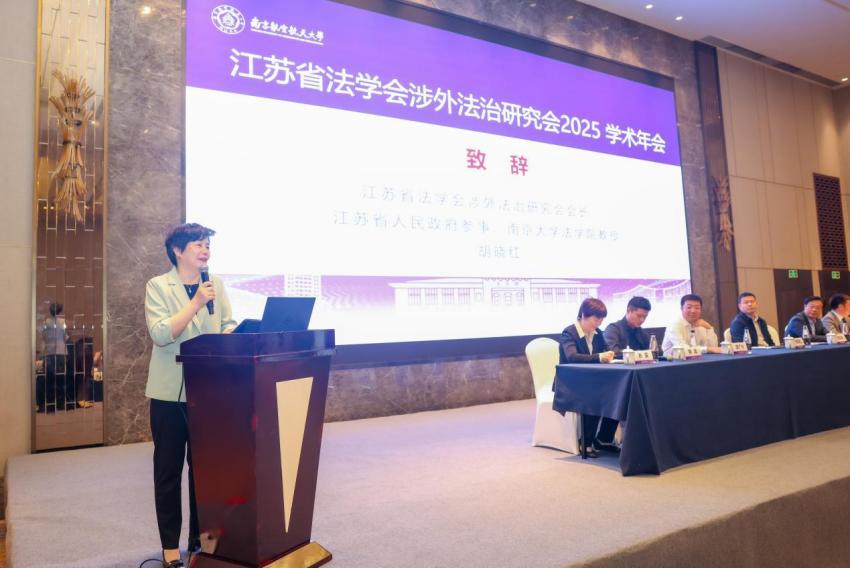 江苏省法学会涉外法治研究会会长、江苏省人民政府参事、南京大学法学院教授胡晓红在讲话中表示,在当前国际环境复杂多变、中美博弈持续加剧的背景下,涉外法治工作者更应坚定法治信念,加强政治判断力,积极构建具有中国特色、自立自主的涉外法治体系。