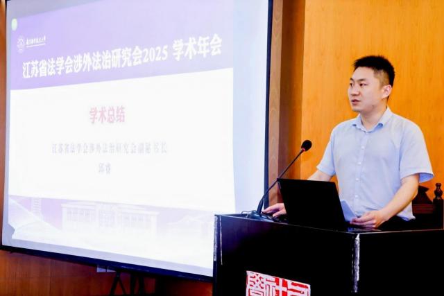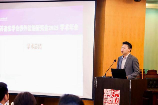 江苏省法学会涉外法治研究会副秘书长邱睿对会议进行学术总结,认为需从理论探索、人才培养、司法实践等多维度协同发力,构建具有中国特色的涉外法治体系。李烨在学术总结中强调推动理论与实务的协同,才能厚植涉外法治根基。