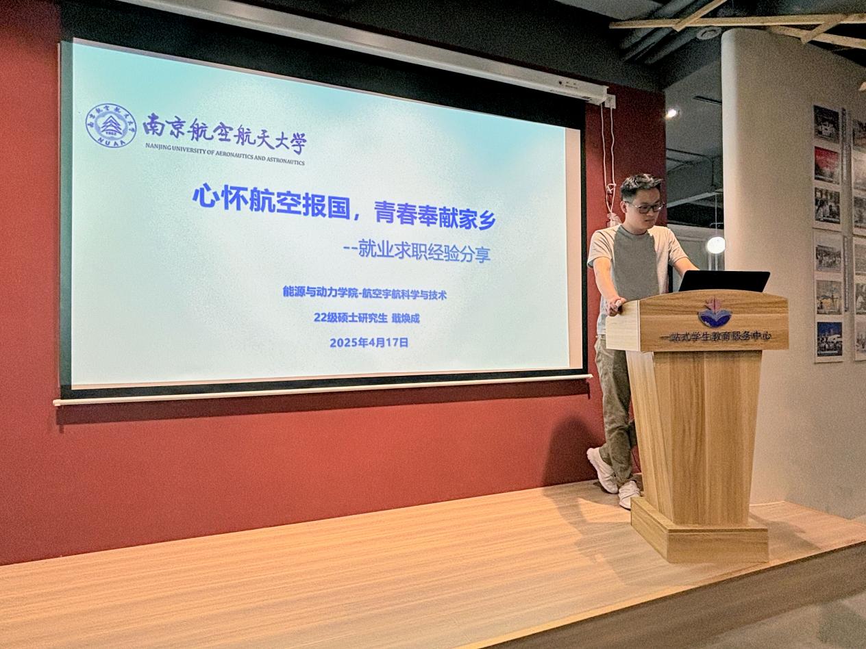 4月17日晚,“就业星talk”基层就业经验分享会在将军路校区“一站式”中心举办。此次活动由大学生就业创业指导服务中心主办,能源与动力学院承办。2025届硕士研究生戢焕成同学做“心怀航空报国,青春奉献家乡——基层选调生就业”主题分享。20余名有志于基层就业的同学参加了活动。