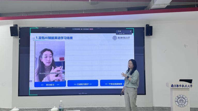 通过展示自己带领的学生团队所制作的AI在实际学习场景中应用的视频,易洋向大家生动展示了生活中如何巧妙运用AI提升学习效率。视频中,学生们展示了如何使用AI生成期末考试复习题目,与AI进行英语对话训练。期间,易洋与在场学生交流AI使用心得,鼓励大家积极尝试并交流自己的经验体会。