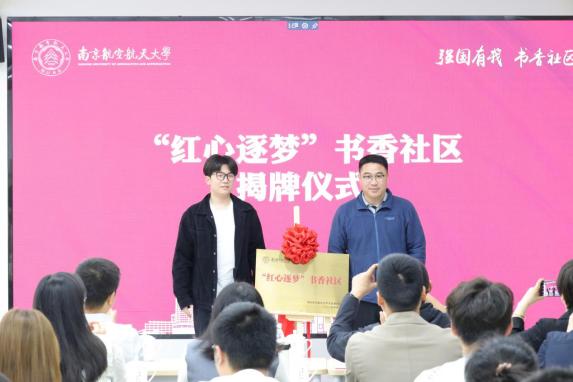 活动伊始,天目湖校区管委会主任缪长宗与学生代表共同为“红心逐梦”书香社区揭牌。