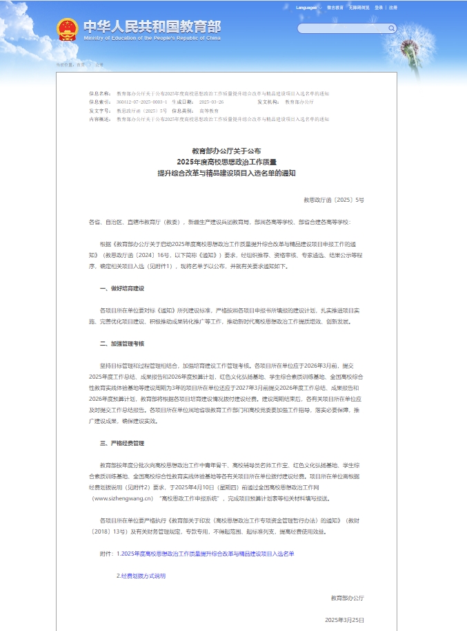 作为全国高校思想政治工作领域的标志性评选,教育部高校思想政治工作质量提升综合改革与精品建设项目着眼“时代新人铸魂工程”提质升级,通过选树培育一批可示范、可引领、可辐射、可推广、可持续的思想政治工作品牌项目,推进高校建设高质量思想政治工作体系、构筑立德树人新格局,为实施新时代立德树人工程提供有力支撑。
