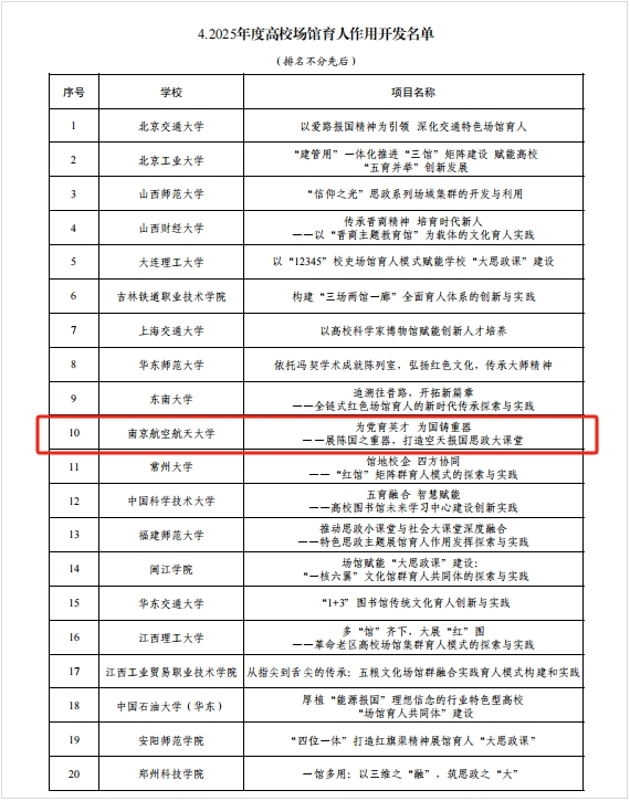 近日,教育部公布2025年度高校思想政治工作质量提升综合改革与精品建设项目评选结果,我校报送的《为党育英才 为国铸重器——展陈国之重器,打造空天报国思政大课堂》项目入选高校场馆育人作用开发名单,这是我校思想政治工作取得的又一重要成果。
