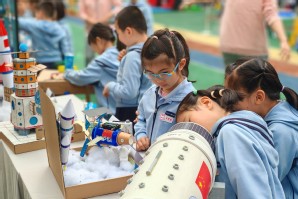 在科学嘉年华活动现场,亲子科技作品展上,矿泉水瓶、纸箱等废旧材料经过巧妙改造,变身为会发光、能移动的科技作品;科学探索区里,孩子们用彩和黏土制作各种各样的航天器,创意十足;会跳舞的机器狗、各种各样智能机器人表演和“雏鹰无人机挑战赛”更是点燃了现场的热情,孩子们在动手实践中体验科技乐趣。特色鲜明的创造性游戏则打造“三航”情景化场景,孩子们在其中合作、创想,充分体现“玩中学”理念 ,为孩子们带来了一场充满趣味与知识的航空航天之旅。