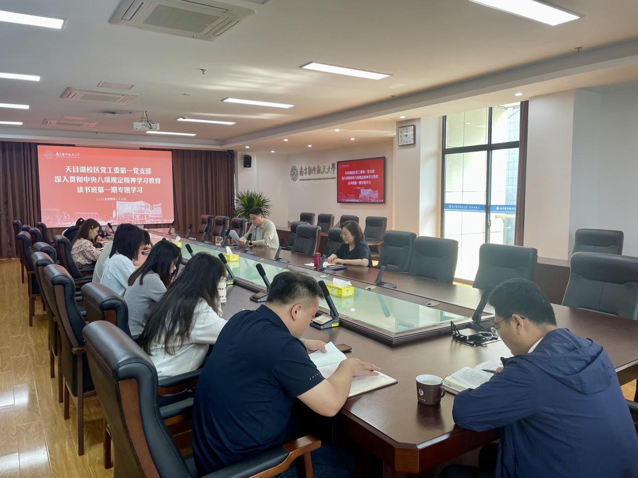为深入学习贯彻中央八项规定精神,进一步加强党的作风建设,4月28日,天目湖校区党工委第一党支部开展深入贯彻中央八项规定精神学习教育第一期专题读书会,支部书记寇晓洁主持会议。